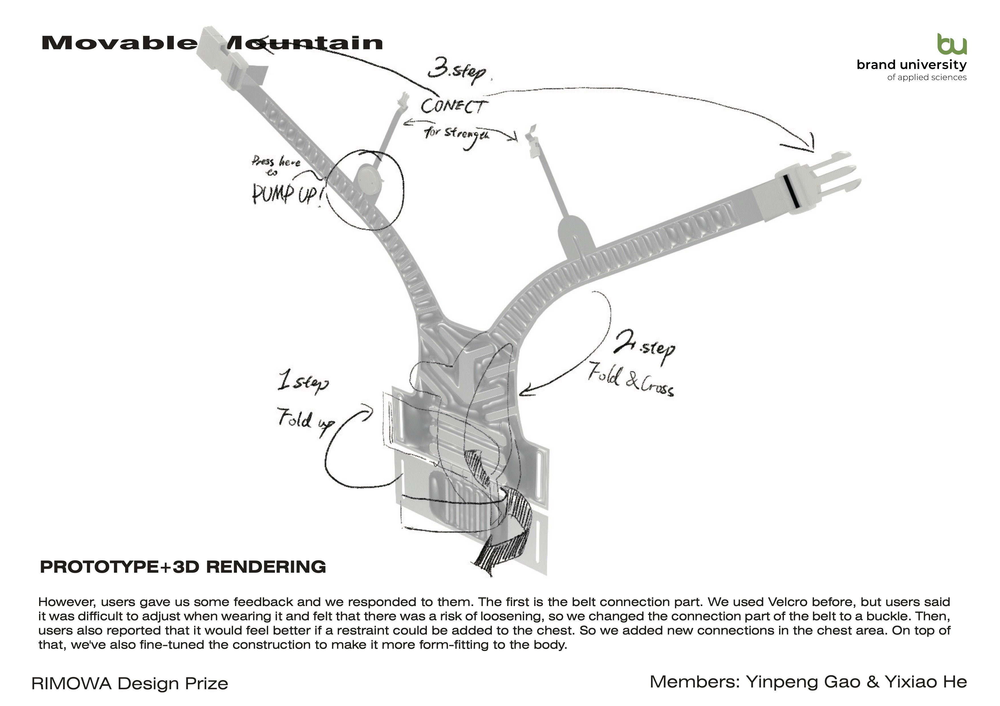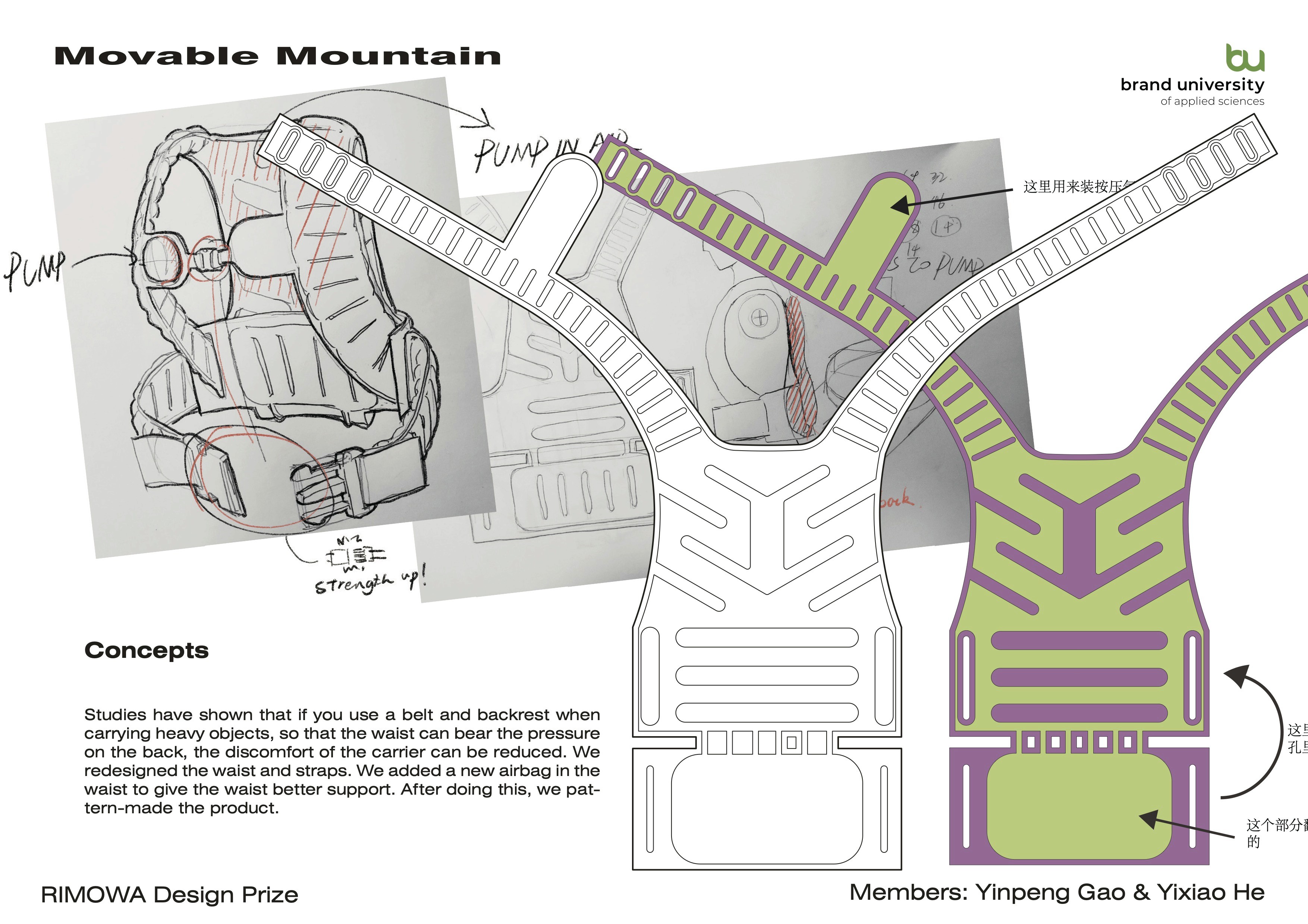 The Movable Mountain is a product made from recycled materials that helps people with heavy loads take the load off their shoulders. Its basic form is a plastic structure made from recycled plastic. Simply fold it and it becomes a "vest" including shoulder straps, backrest and waist protector. Before carrying heavy objects, unpack the movable mountain, just fold it and inflate it, then carry it on your back, it will become a very useful helper. This work was shortlisted as a semi-finalist for the RIMOWA Design Award 2024.